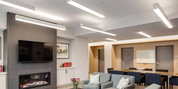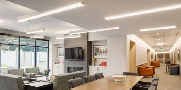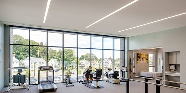 At Jerome Home, Day-O-Lite was tasked with developing continuous custom linear fixtures that transition from suspended to semi-recessed in the same space. The finished installation is functional, efficient and lends an interesting aesthetic to the client’s exercise and rehab facility.