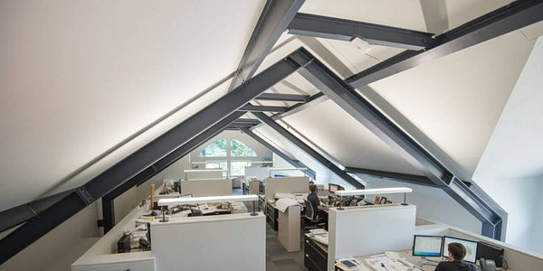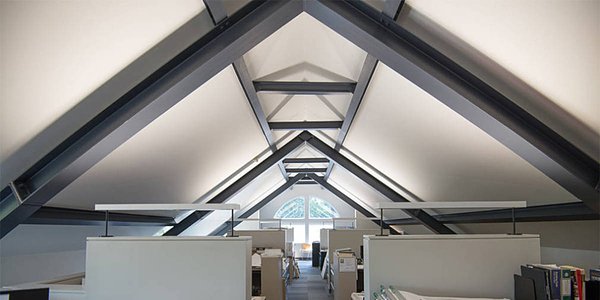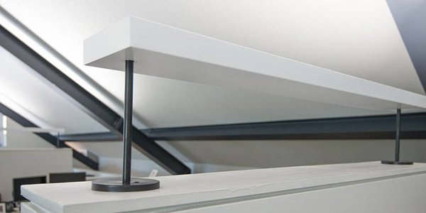 Day-O-Lite's design & engineering team created unique custom Elite (ELTL-1-I) linear fixtures per client specifications. Stantion mounted, the indirect luminaires are startegicall mounted to partions dividing working cubicles. The design was pratical as it was effecient in that it avoided the suspended fixtures from the busy, pitched ceiling.