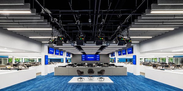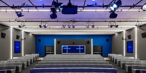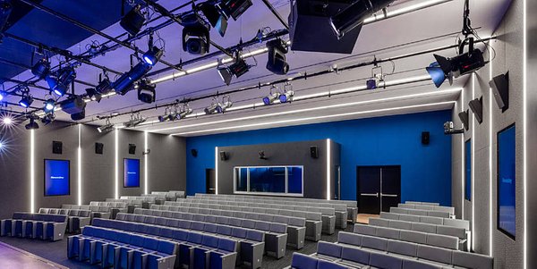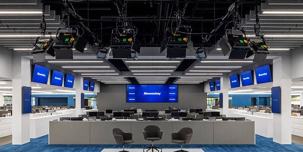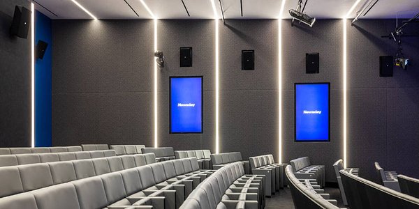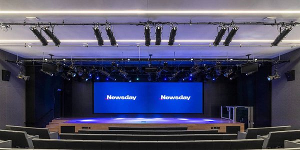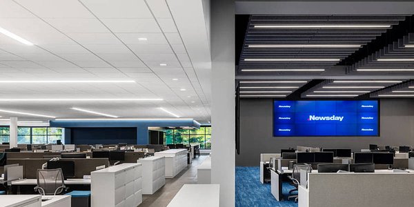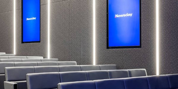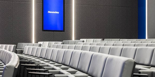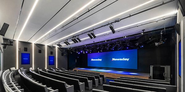 Newsday's Long Island headquarters and studio uses Profile 24 (PRFL-24-D) recessed linear luminaires in custom ceiling patterns, and in a recessed wall to ceiling transition. The installation frames the auditorium with long lines of illumination for a unique installation that is both inviting and well illuminated.