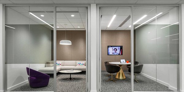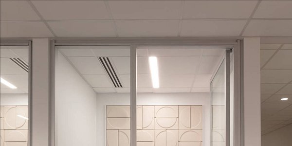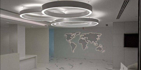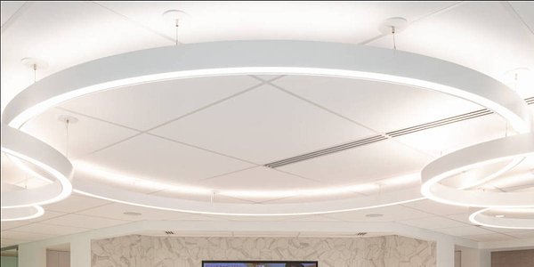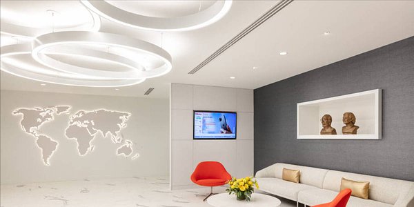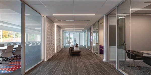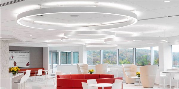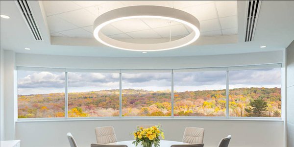 Hikma Pharmaceuticals' new office spaces feature Compass (COML-44-DI) suspended direct/indirect rings to 16' in diameter and Profile (PRFL-44-D) recessed linear luminaires.
