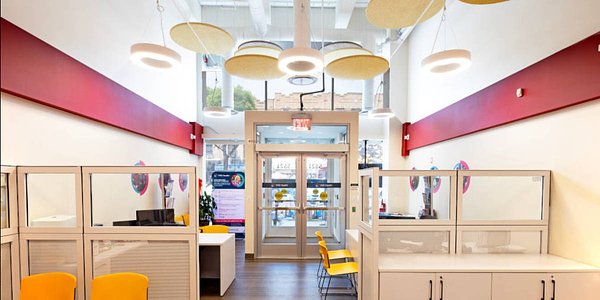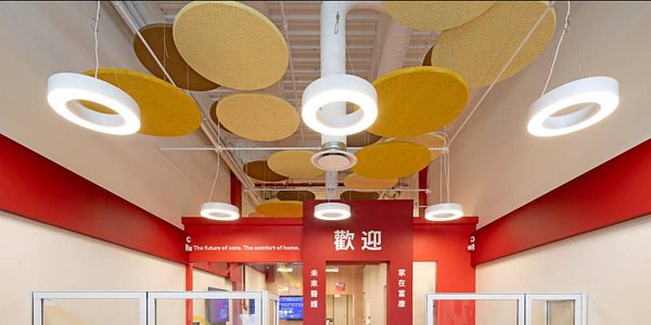 At the Visiting Nurses Services office in Brooklyn, NY, Compass Ring (COML-44) pendants deliver high-output, energy-efficient lighting in a suspended direct configuration. Installed in tandem with circular acoustic panels, the 2' diameter luminaires form a floating ceiling element that blends visual whimsy with functional intent.