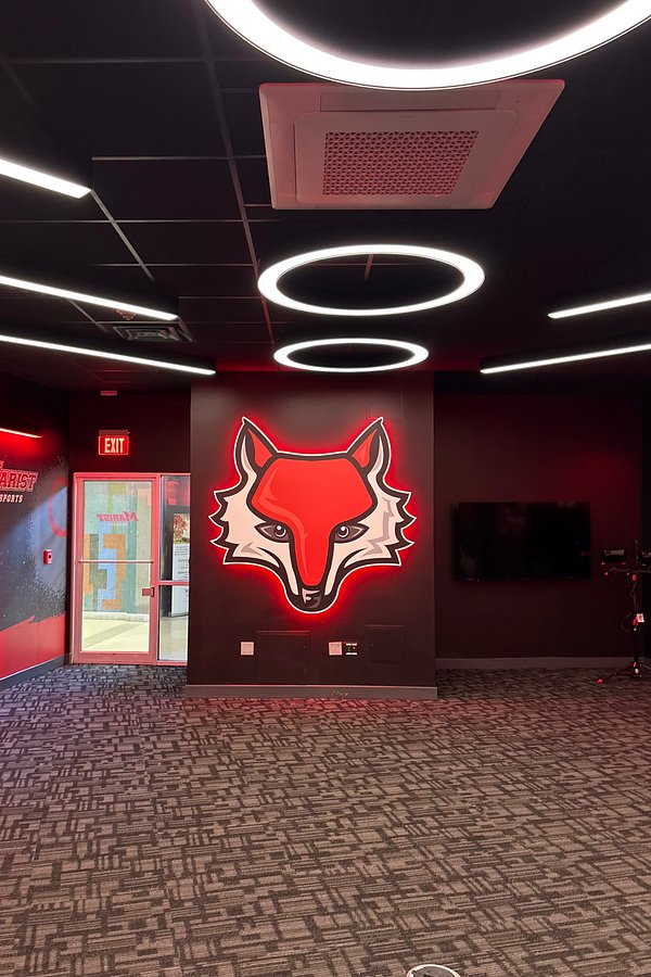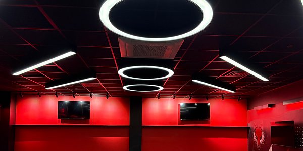 Marist College’s new Computer Lab called for a lighting strategy that would express both technological precision and creative energy. At the core of the space, Compass 44 Rings and Profile 44 Linear Pendants establish a crisp, architectural layer of white light - delivering strong visual contrast against the saturated red walls and dark ceiling plane.